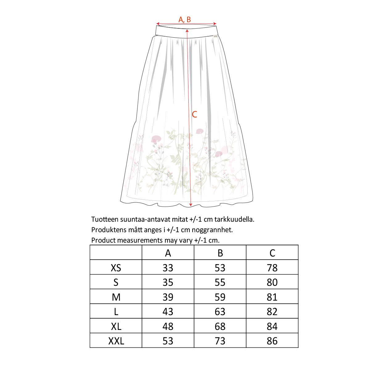 Juhlavan kaunis musta aikuisten tyllihame jossa on joustava vyötärö. Päällä olevaan tyllihameeseen on brodeerattua kauniita kukkia ja lehtiä. Alushame on hieman lyhyempi kuin päällyshame. Mekko on valmistettu mukavasta polyesteristä.
