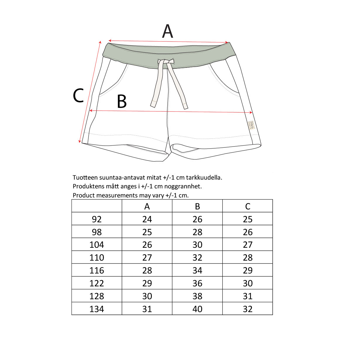 Pehmeästi väritetyt lasten lyhytlahkeiset shortsit, joissa on joustava vyötärö, kiristysnyörit ja sivuilla taskut. Shortsien luonnonvalkoisella pohjalla on akvarellimainen Kalat-kuosi.