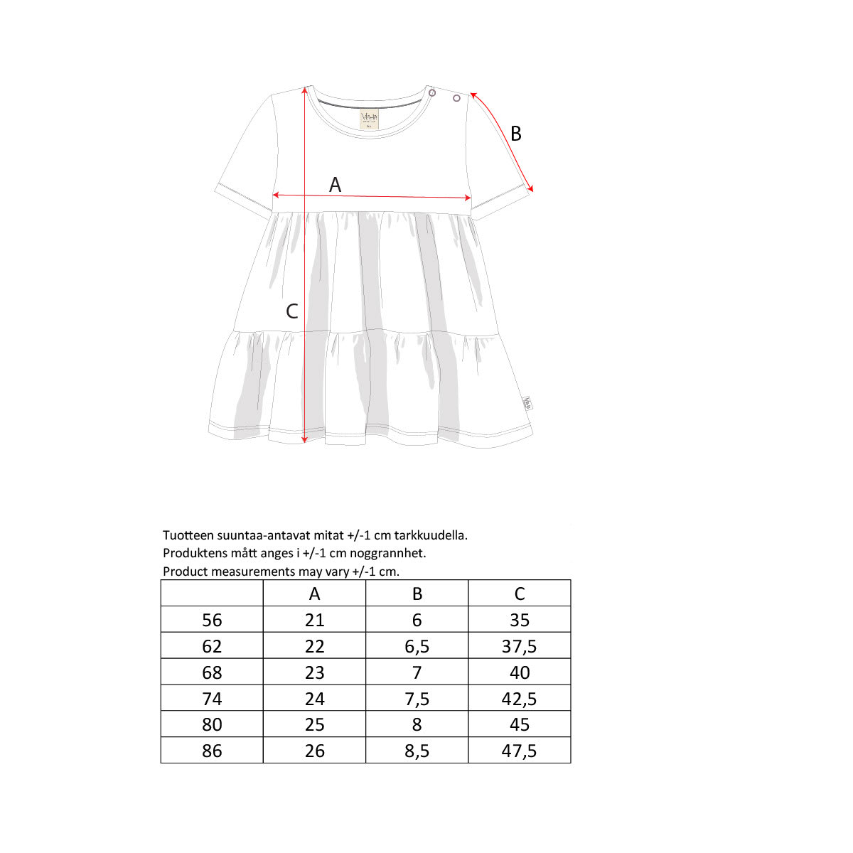 Luonnonvalkoinen lasten lyhythihainen mekko, jossa on kahdesta frillasta koostuva runsas helma. Mekossa on hempeän suloinen Kesäkuu-kuosi.