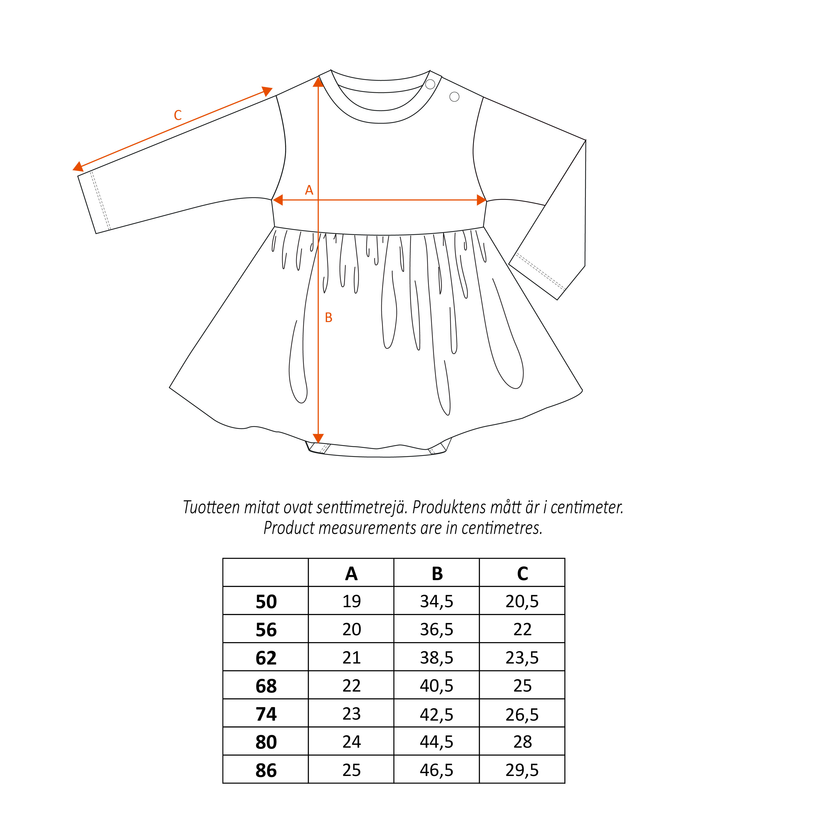 Kukikas vauvojen pitkähihainen bodymekko, jonka runsaan helman alla on bodyn alaosa ja pääntiellä suloinen pitsireunus. Luonnonvalkoista bodymekkoa on erityisen mukava käyttää, ja se pysyy hyvin yllä. Mekossa on suloisen leikkisä Talvipuutarha-kuosi.