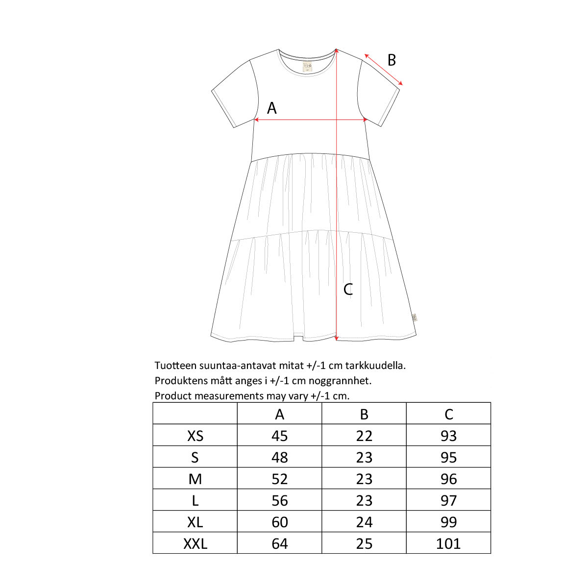 Lempeän luonnonvalkoinen A-linjainen lyhythihainen mekko, jonka helma koostuu kahdesta leveästä frillasta. Mekossa on hempeän suloinen Kesäkuu-kuosi.