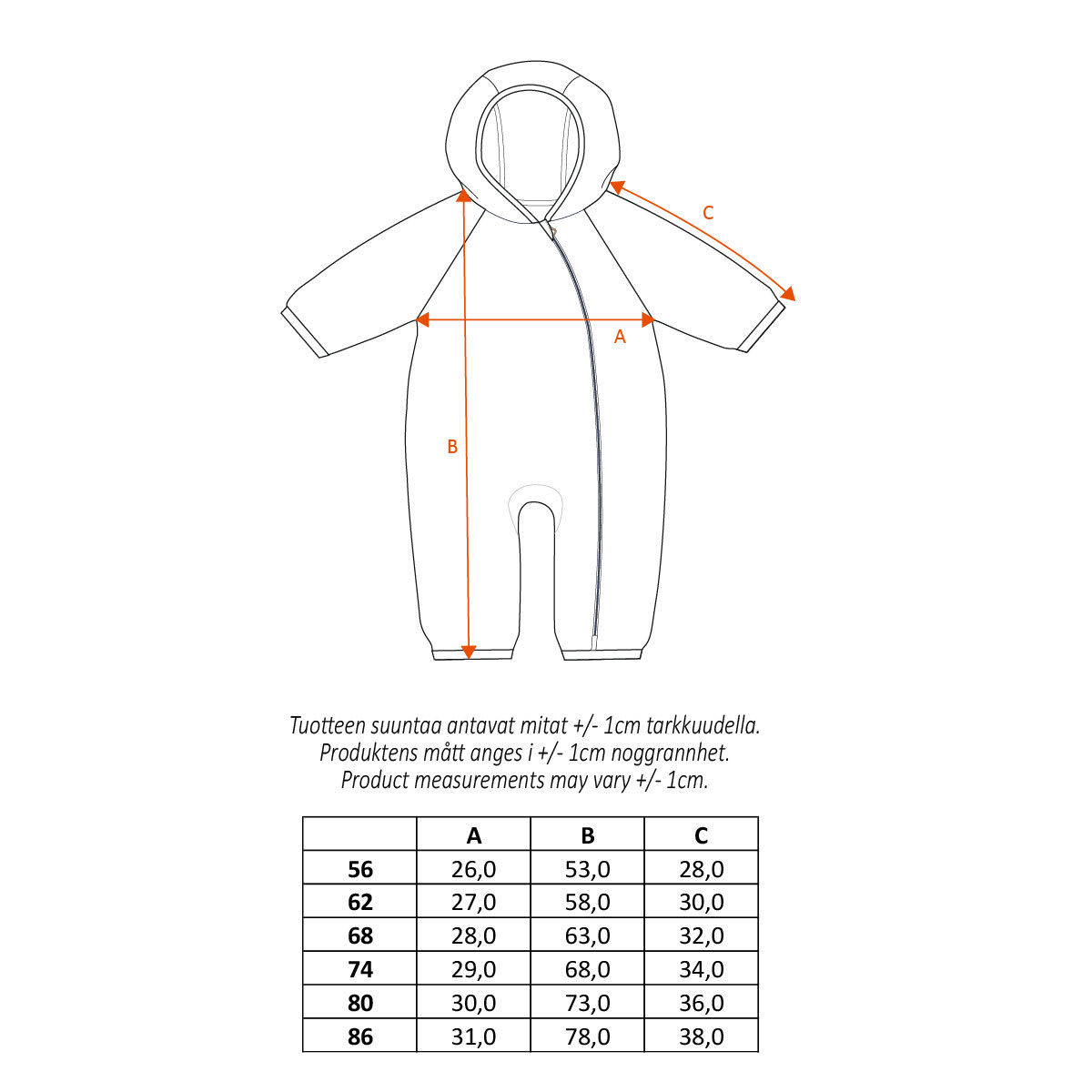 Petroolinvihreä vauvojen hupullinen haalari, jossa on pitkä kaksisuuntainen vetoketju ja pehmeäksi harjattu sisäpuoli. Haalarin hyväntuulinen kuosi on täynnä Muumien kotitalon ympärille keskittyvää elämää. Monikäyttöinen haalari sopii autoreissuille, viileämpiin päiviin, kauppaan tai vaunuihin päiväunien ajaksi