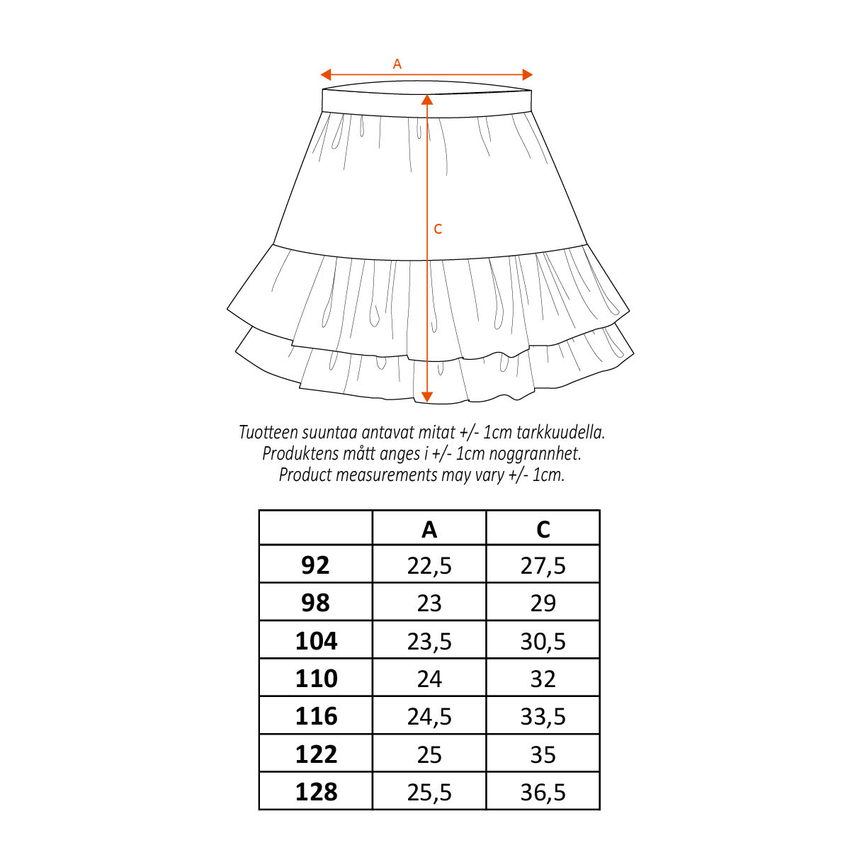 Aurinkoisen keltainen lasten hame, jossa on joustava vyötärö ja helmassa kaksi päällekkäin asettuvaa frillaa. Hameessa on kesäinen Ranta-kuosi.