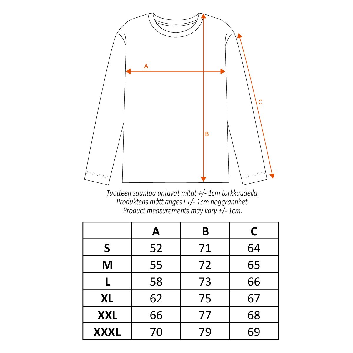 Musta miesten pitkähihainen paita Muumi-mallistostamme jossa on mukava suora malli ja pyöreä pääntie. Paidan rinnassa on kuva vihaisesta Muumipeikosta. Muumipeikosta on suurempi kuva selässä ja teksti: Bless my tail, I do feel strong!