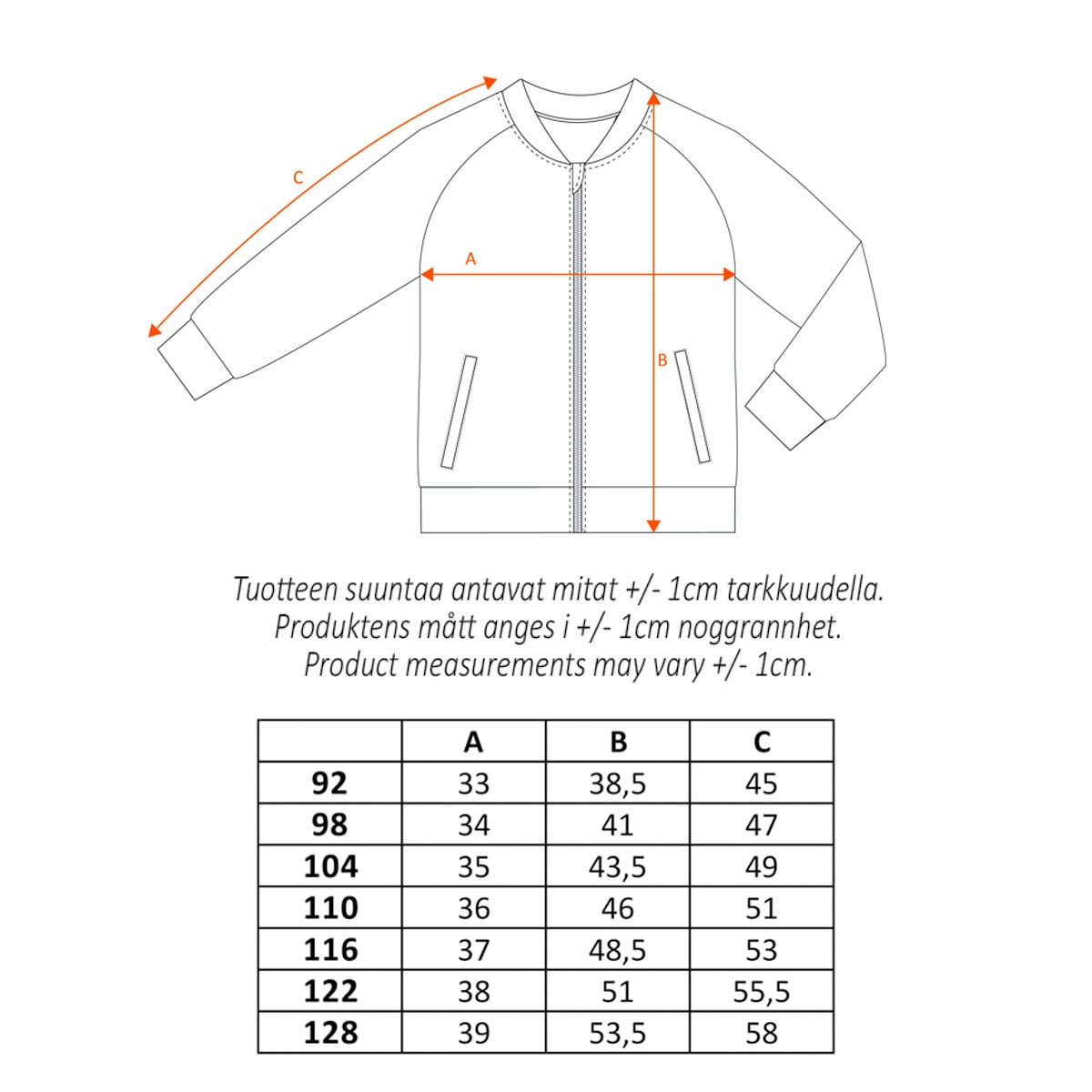 | Pesuohje | 40 °C – Pese samansävyisten kanssa, sulje vetoketjut ennen pesua |