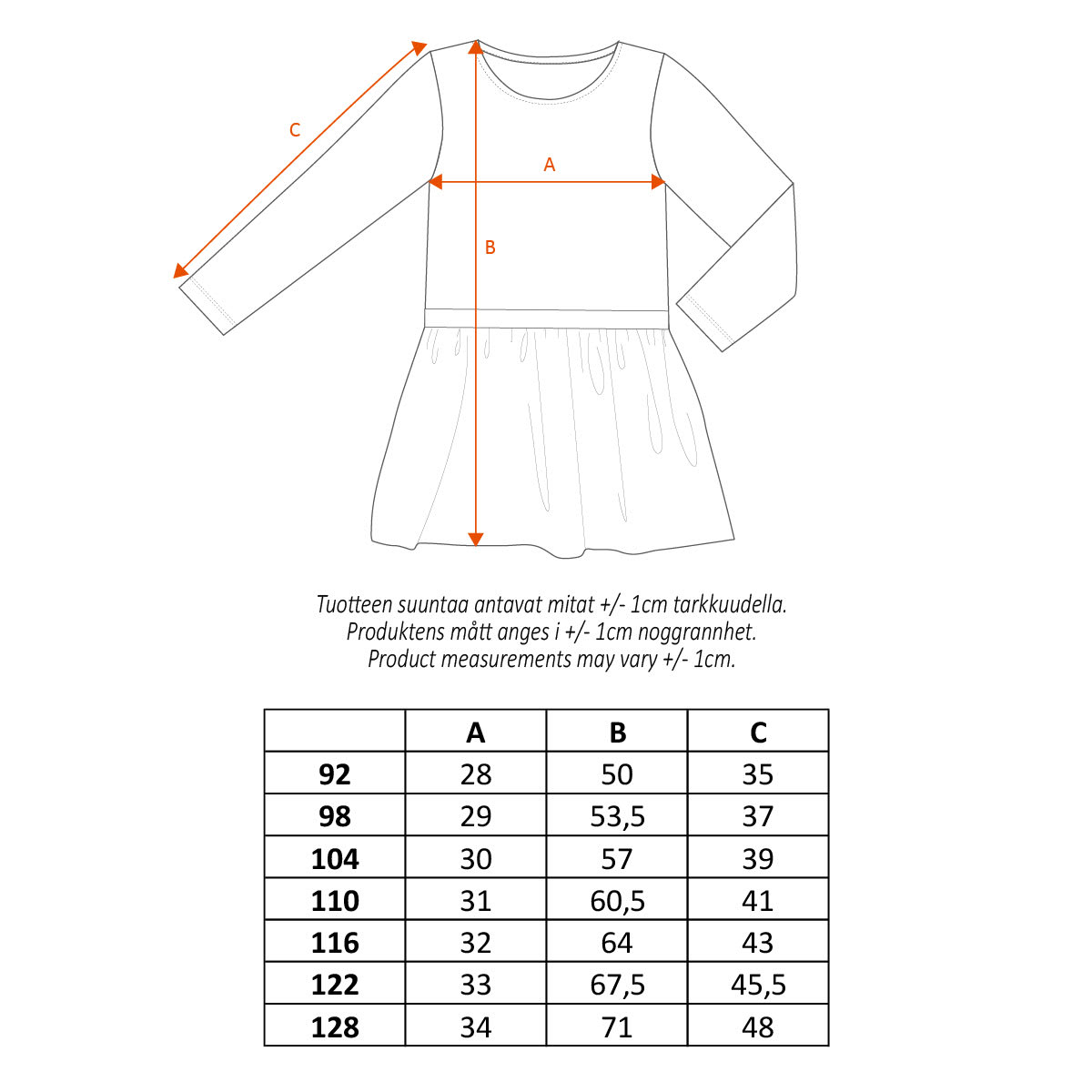 Tummanpunainen Peppi Pitkätossu-mallistoomme kuuluva lasten pitkähihainen mekko, jossa on samettinauha sekä pehmeästi laskeutuva tyllihelma. Tyllimekossa on juhlava Ilmapallot-kuosi.