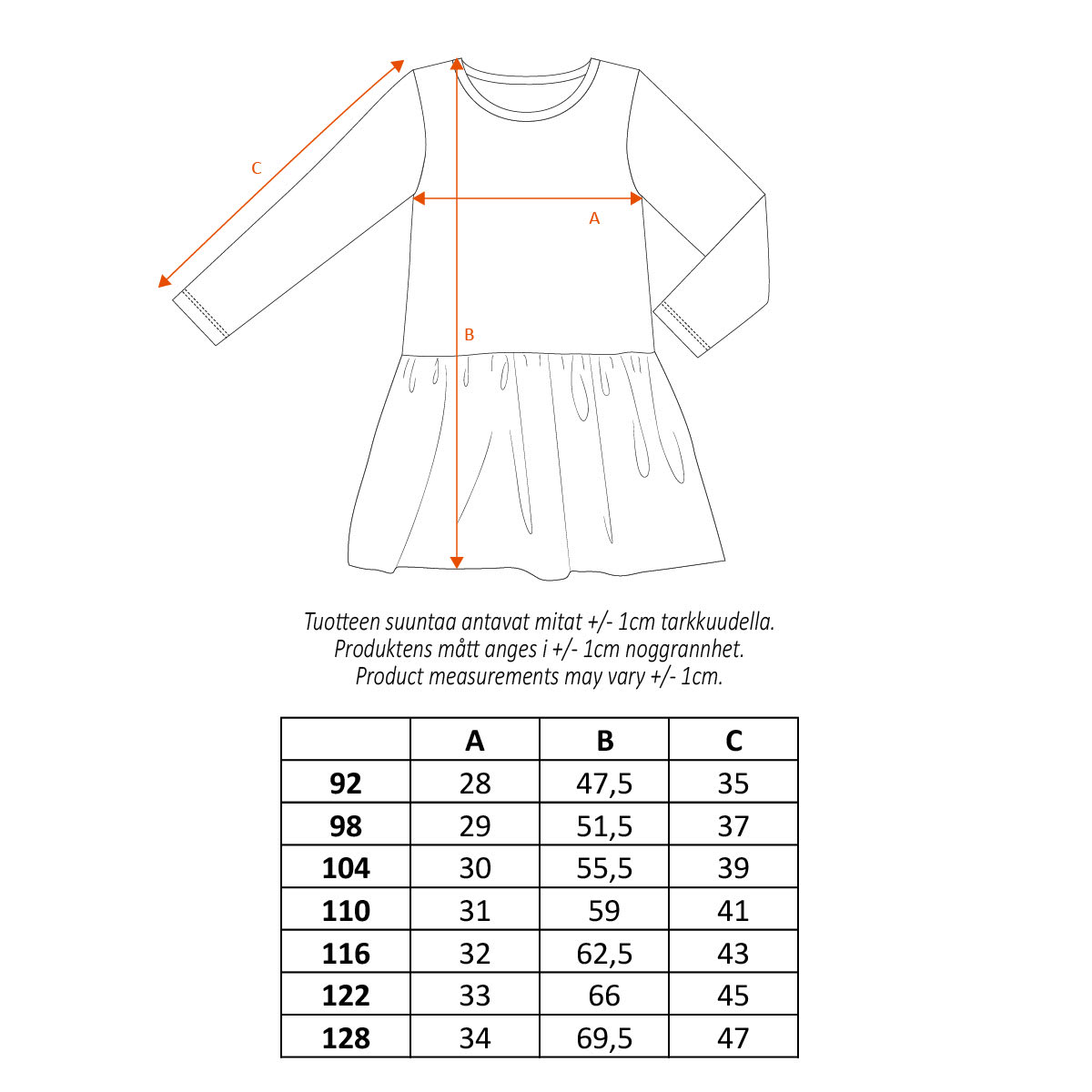 Raikkaanvihreä lasten pitkähihainen mekko, jossa on mukava paitamainen yläosa, leikkaus vyötäröllä ja rypytetty helma. Mekossa on hyväntuulinen Itsevarma-kuosi, jonka tähtenä seikkailee maailman vahvin tyttö, rakastettu Peppi Pitkätossu.