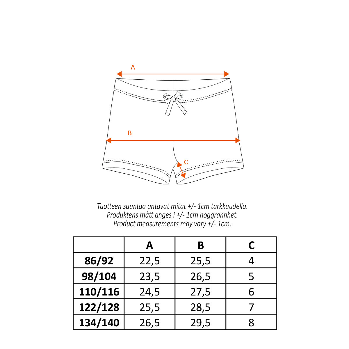 Syvän siniset lasten uimahousut, joissa on joustava vyötärö, kiristysnauhat ja vuoritettu etuosa. Uimashortseissa on iloinen kuva maailman vahvimmasta tytöstä, Peppi Pitkätossusta. Peppimäistä iloa rantaleikkeihin taikka uima-altaassa polskutteluun!